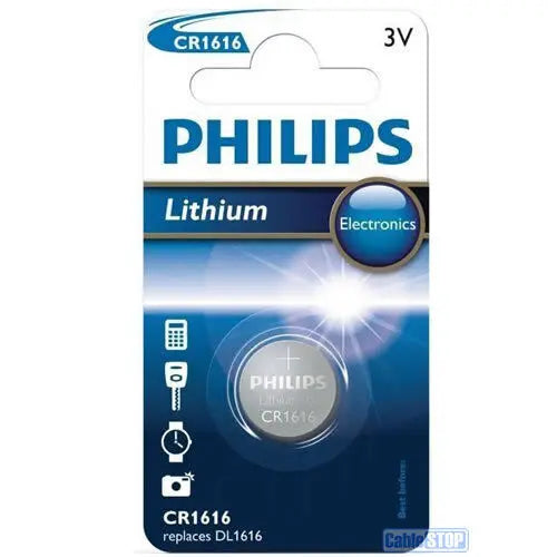 Model: CR1616 - 3v Also known as 1616, DL1616, KCR1616, BR1616Philips is one of the leading brands when it comes to Cell BatteriesUsed for Watches, Key Fobs, Car Alarms, Cameras, Calculators, Games, Toys etc...Will fit any...Regular price £1.00 -