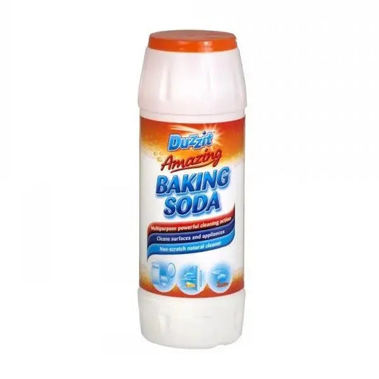 DUZZIT CLEANING BAKING SODA 500G Duzzit Baking Soda is a non-scratch natural cleaner that effectively removes stubborn stains from kitchen, bathroom, ovens, and bakeware. It can be used by shaking, adding hot water, and re-sealing the...Regular price £1.39