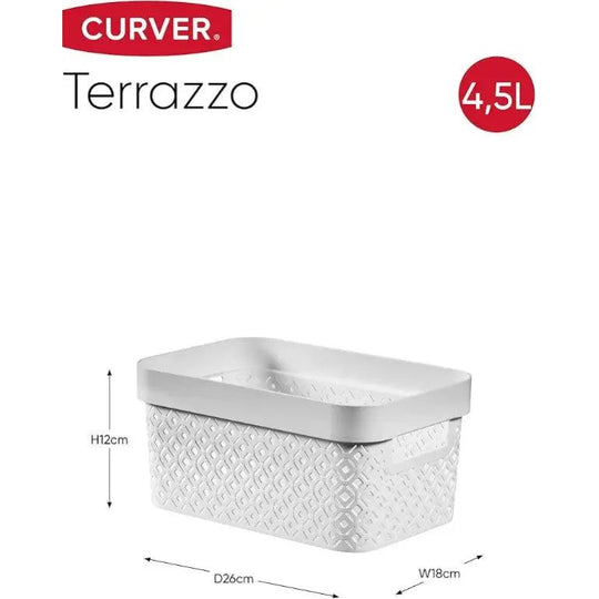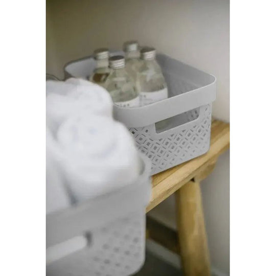 White Nestable Plastic Rattan Storage BasketShelf TrayL 25.5 x W 19.5cm x H 10cm approx.Stylish and practical.Natural fibre look.Light weight and hardwearing.Ideal for small books, small toys, CD's, hobby and craft, stationery and more.Regular price £1.99