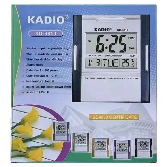 Kadio Digital Jumbo Wall Mount & Table Temperature Display Clock KD-3810 Light pearlescent navy and silver finish.Jumbo LCD displayWall mountable & Stand for desktop display.Alarm with optional hourly musical chime.Calendar for 200 years.Regular price £6.99 -