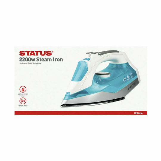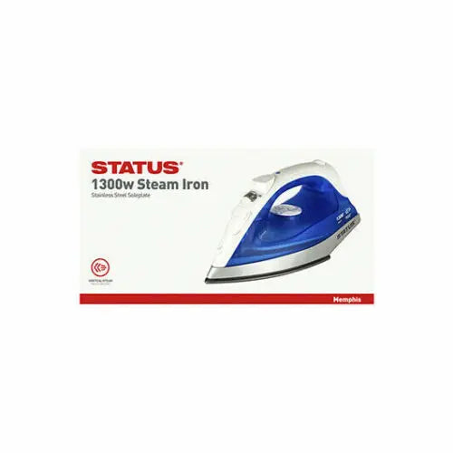 Status Steam Iron Blue1300w4 heat settings3 steam settingsNon stick soleplate150 ml water tank capacity1.9 meter cordStatus 1300w Steam IronNon Stick soleplatePlate Dimensions 18cm × 10cmPower on Indicator LightSpray FunctionContinuous Temperature ControlOverheat ProtectionRegular price £11.99