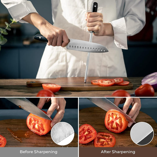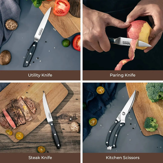 ✅WHAT YOU GET: 14 pieces knife set for kitchen includes 8" chef knife, 8" slicing knife, 7" Santoku knife, 5" utility knife, 3.5" paring knife, 4.5" serrated steak knives of 6pcs, kitchen scissors, knife sharpener rod,...Regular price £28.99