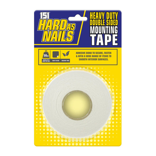 Hard as Nails Double Sided Heavy Duty Mounting Tape. No need for nails. Solvent Free. Simply Peel and Stick. Holds upto 50kg approx. per roll.Regular price £1.45 -