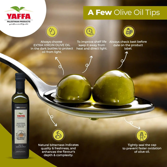 100% Extra Virgin Olive Oil: Yaffa Olive Oil is cold-pressed from 100% Palestinian olives, ensuring a product that is free from harmful chemicals and additives. Experience the purity and quality of this Extra Virgin Palestinian Olive...Regular price £12.50 -