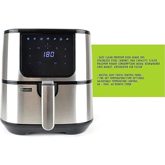 The HealthKick Digi-Touch Air Fryer 5.5L 1800W in Stainless Steel uses rapid ‘heatwave’ technology to fry, grill, bake or steam.HealthKick Digi-Touch Air Fryer 5.5L 1800W Stainless SteelUses rapid ‘heatwave’ technologyFry grill bake steamUse 80% less oilDigital...Regular price £76.99 -