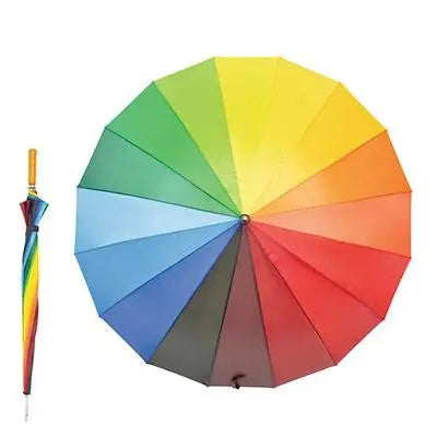 The Rainbow Golf Umbrella is a stylish and vibrant umbrella designed for golf courses and everyday use. Its large canopy offers rain coverage and sturdy construction, while its eye-catching rainbow design adds colour and protection.