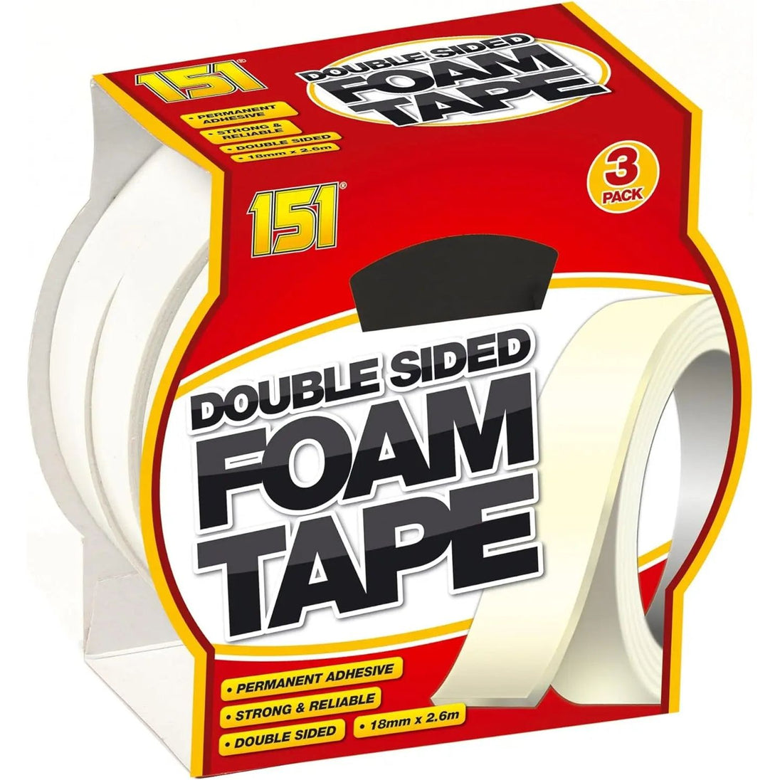 TRIPLE TAPE PACK: 151 Double Sided Foam Tape, supplied as a pack of 3 rolls. Each roll is 18mm x 2.6m, foam thickness of 1.25mm