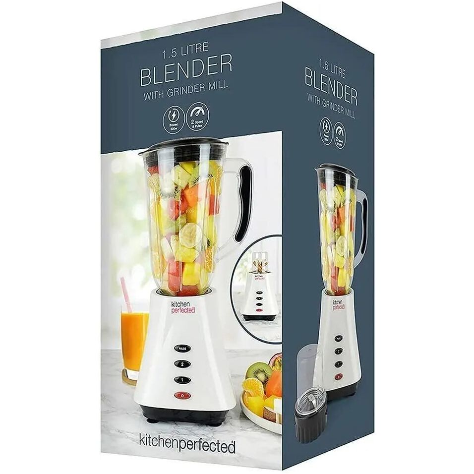 This blender features 2 speed settings, a pulse function button for short bursts, stainless steel blades for fine blending, a grinder mill attachment for coffee, spices, and herbs, and rubber suction feet for durability. It also includes a grinder mill attachment for grinding coffee, spices, and herbs.